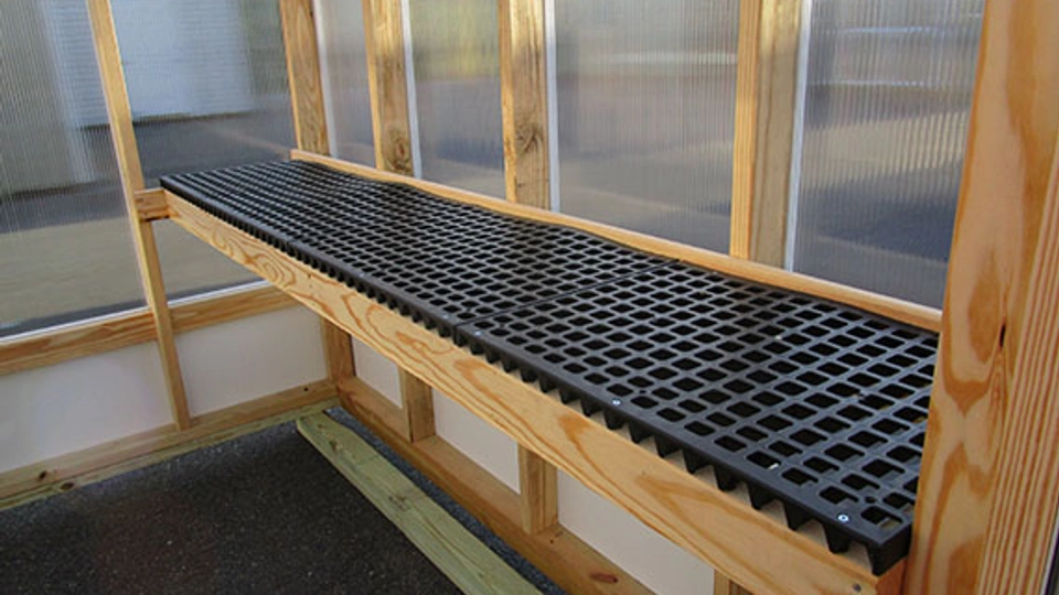 Surface is a heavy-duty polypropylene panels. Durable, smooth and non-porous. Easy to clean – No splinters or rough edges – UV protective – high impact – abrasion resistant. Securely screwed onto wooden bench frame so there’s no slipping or sliding around. Square holes allow water, potting soil and debris to drain right through.