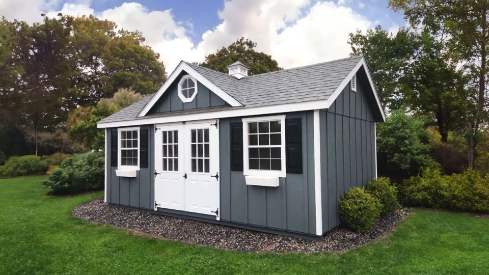 Our distinct triangular dormer on the Cape Cod Dormer Shed gives you a beautiful and unique look. This shed includes double doors and a single fiberglass raised panel door with arched glass. Optional shutters and flower boxes are popular options and are a great way to further elevate the style of your double door storage shed.